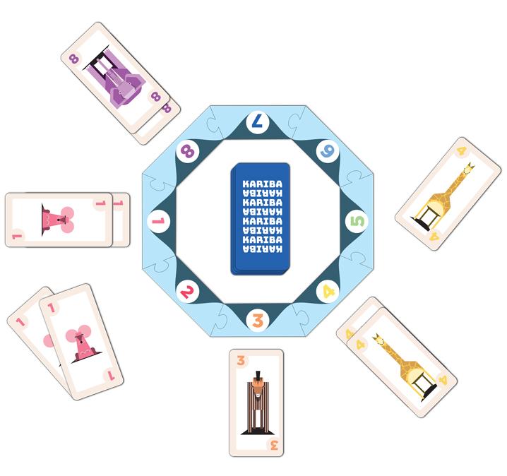 Kariba is a smart card game. Africa is hot and water is scarce. The animals want to find a waterhole where they can refresh themselves. Of course, every animal wants to be the first to drink and so the elephant chases away the rhino, and the rhino chases away the mouse. But it is well known that elephants are afraid of mice. Therefore the little mouse chases away the elephant.