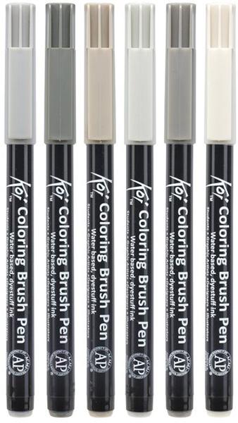 Ett 6-pack med olika gråa färger från Sakuras Koi Coloring Brush pen sortiment. Pennorna är vattenbaserade och har en mjuk flexibel penselspets som du enkelt kan teckna både breda och tunna streck med. Färgerna kan enkelt blandas med varandra eller vatten för fina färgövergångar eller akvarell effekter. Vi säljer även Sakura Koi Coloring Brush pennorna styckvis.