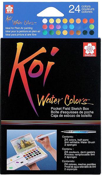 Lyxigt akvarell-set med 24 st halvkoppar, en påfyllningsbar pensel samt en svamp. Prisvärd och lätt, perfekt att ta fram under resor eller för att måla utomhus!