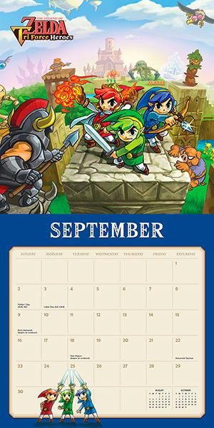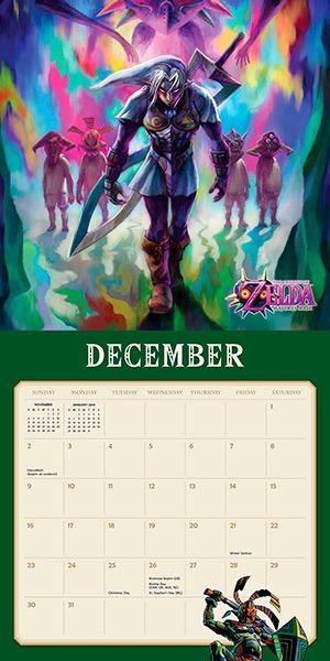 12-månaders väggalmanacka med bilder på figurer från Zelda-spelen. Obs! Ej svenska högtider!