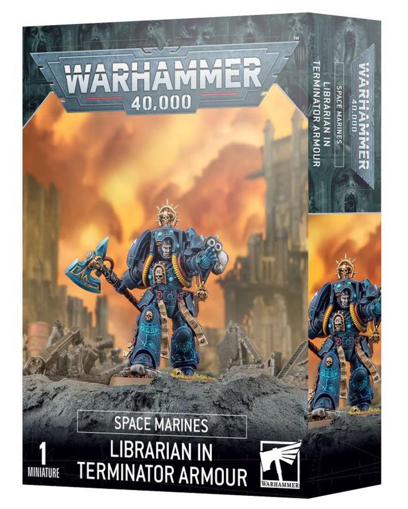 This multipart plastic kit builds a Librarian in Terminator Armour, a psychic powerhouse of his Chapter. He wields a force weapon – a destructive focus for his mental energies – in the form of an ornate axe, while a wrist-mounted storm bolter spits shells at his foe. The Librarian's imposing armour is decorated with the horned skull symbol of the Librarius, features warding sigils etched directly into the ceramite, and incorporates a psychic hood that aids him in resisting enemy witchcraft.