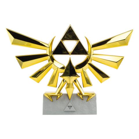 Impressive figural mood light is shaped like the Hyrule Crest from The Legend of Zelda. Sits elegantly atop a mock stone base with a Triforce button embedded at the bottom.