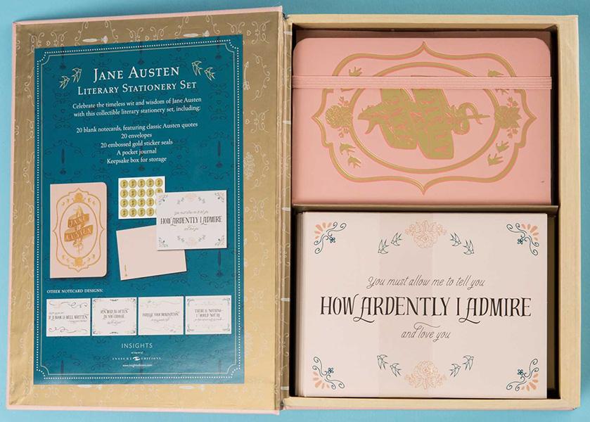 En utomordentligt trevlig litterär samling med 20 kuvert, 20 vykort med klassiska Austencitat, 20 runda guldklistermärken samt en liten anteckningsbok, allt samlat i denna praktiska rosa låda.