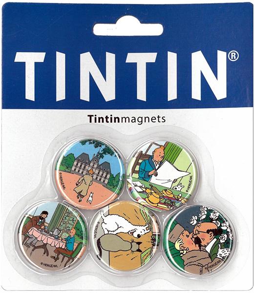 Set of 5 decorative fridge magnets of Tintin at the Moulinsart Castle. Diameter of each magnet: 33mm.