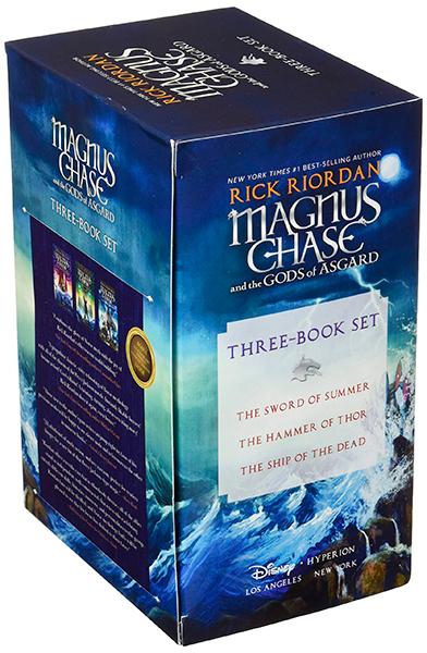 En box med pocketutgåvor av alla tre böckerna i serien: Magnus Chase and the Sword of Summer, Magnus Chase and the Hammer of Thor och Magnus Chase and the Ship of the Dead.