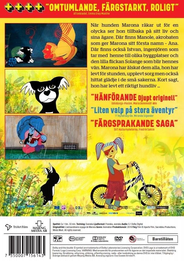 Ett färgsprakande hundliv När hunden Marona råkar ut för en olycka ser hon tillbaka på sitt liv och sina ägare. Där finns Manole, akrobaten som ger Marona sitt första namn – Ana. Där finns också Istvan, ingenjören som tar med henne till olika byggplatser och den lilla flickan Solange som blir hennes bästa vän. Marona har älskat dem alla, hon har levt för stunden och hittat glädje i de små sakerna. Kort sagt, hon har levt ett riktigt hundliv … Bland de svenska rösterna hörs Klara Söderberg från First Aid Kit, Ebbot Lundberg från Soundtrack of our Lives samt Dramaten-skådespelarna Andreas T Olsson och Ana-Gil de Melo Nascimento (Mysteriet på Greveholm, Jordskott).