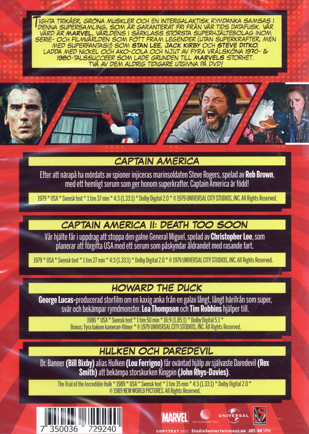 Tighta trikåer, gröna muskler och en intergalaktisk rymdanka samsas i denna supersamling, som är garanterat fri från vår tids datafusk. Vår värd är MARVEL, världens i särklass största superhjältebolag inom serie- och filmvärlden som fött fram legender (utan superkrafter, men med superfantasi!) som Stan Lee, Jack Kirby och Steve Ditko. Ladda med Nickel och AKO-cola och njut av fyra vrålsköna 1970- & 1980-talssuccéer som lade grunden till Marvels storhet. Två av dem aldrig tidigare utgivna på DVD!