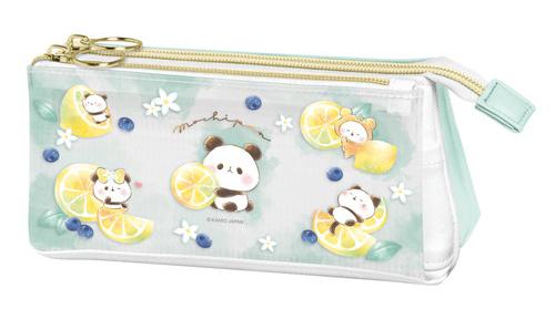 Behändigt pennfodral med gulliga pastellfärgade illustrationer av pandorna från Mochi Pan som leker med citroner.