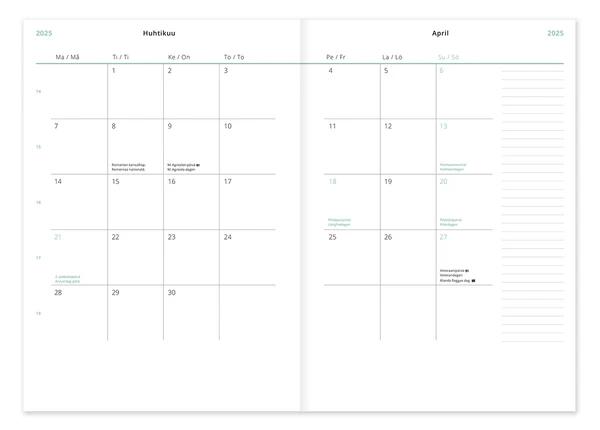 Innehåller finska och finlandssvenska namn- och flaggdagar samt månens faser.