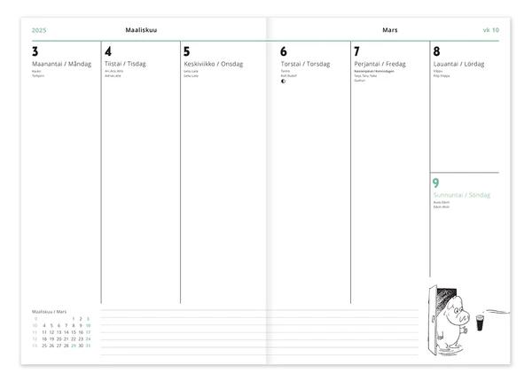 Inbunden veckokalender för 2025. Bilden på kalenderns omslag är från Tove Janssons bok Småtrollen och den stora översvämningen.