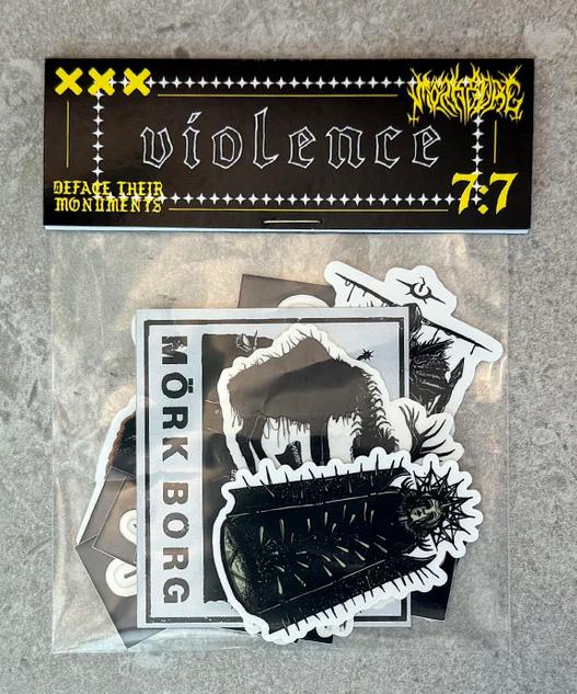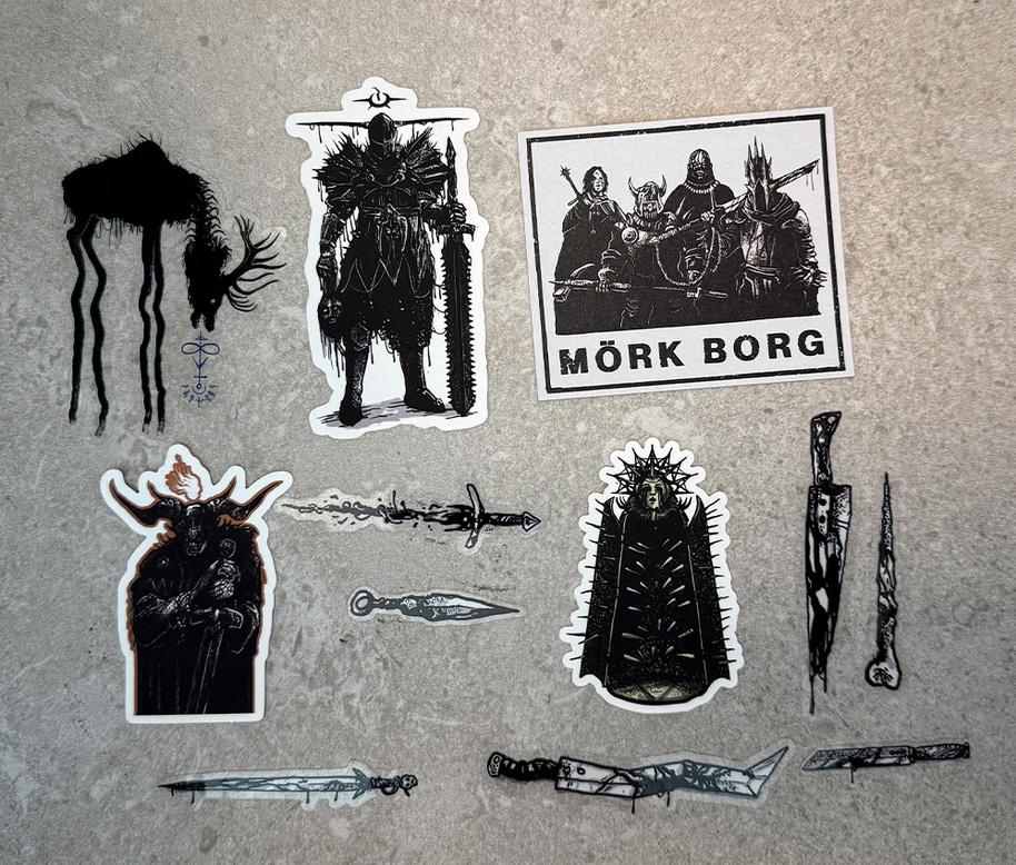Sticker pack with twelve small stickers (4-8 cm depending on sticker). Mix of transparent, standard white vinyl and recycled paper stickers. Time to add swords to stuff.