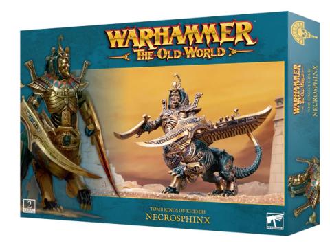 Necrosphinxes are terrifying war-constructs, patterned after the various mythical beasts that inhabit the Nehekharan underworld. A human torso and face extends from a colossal leonine body, combined with ornate, falcon-like wings and a deadly scorpion's tail. Equipped with gigantic, scything blades that can sever a Dragon's neck in a single slice, a Necrosphinx glides into battle with unnatural power, descending on its chosen prey and reaping souls like wheat.