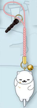 Hänge med katten Tubbs från kattsamlarspelet Nekoatsume som netsukefigur och en liten bjällra, samt en plugg för mobilens ljudkontakt. Själva katten är c:a 4cm hög.