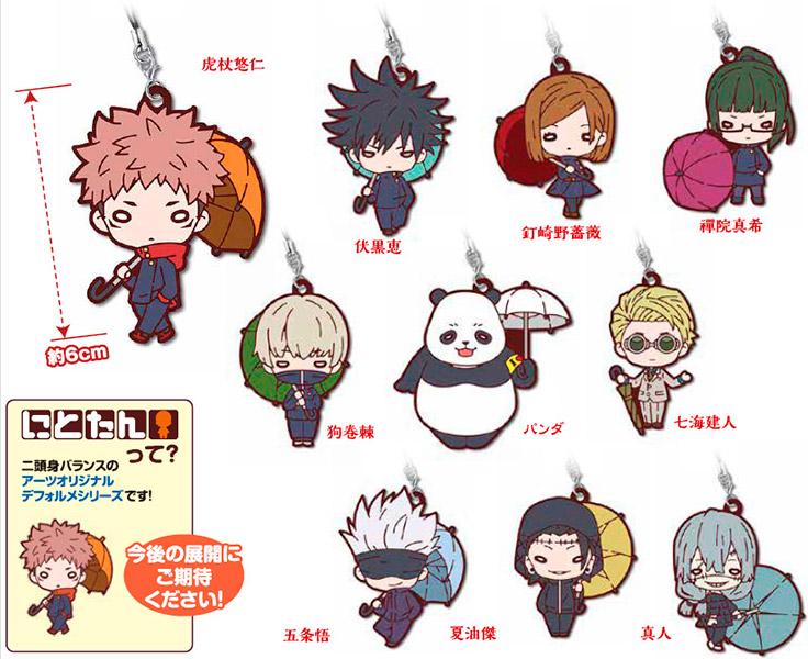Gullig figurskuren gumminyckelring med en av karaktärerna från Jujutsu Kaisen som håller i ett litet paraply. Du får en av 10 olika och varje nyckelring är cirka 6 cm.