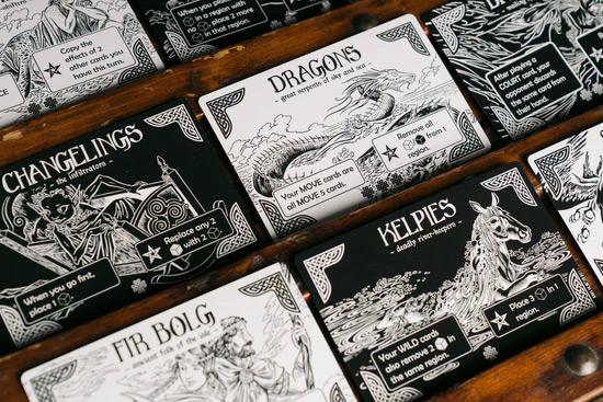 In Pacts, you shall rule one of these two courts, facing your eternal opponent in a duel of wits. Before starting, each of you will gain the assistance of mythological creatures such as dragons, banshees, and selkies to give you the edge. Each round, cards are dealt, where one player will split the possible actions between two piles, while the other will select who gets which set. You will each place, move, and remove influence across six regions and see who rules these sacred places, seeking majority control. The player who scores the best after three and six rounds will be declared the new ruler of this great isle.