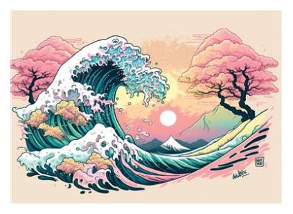 Vykort med motiv föreställande en jättevåg som sveper fram över ett pastellfärgat landskap.