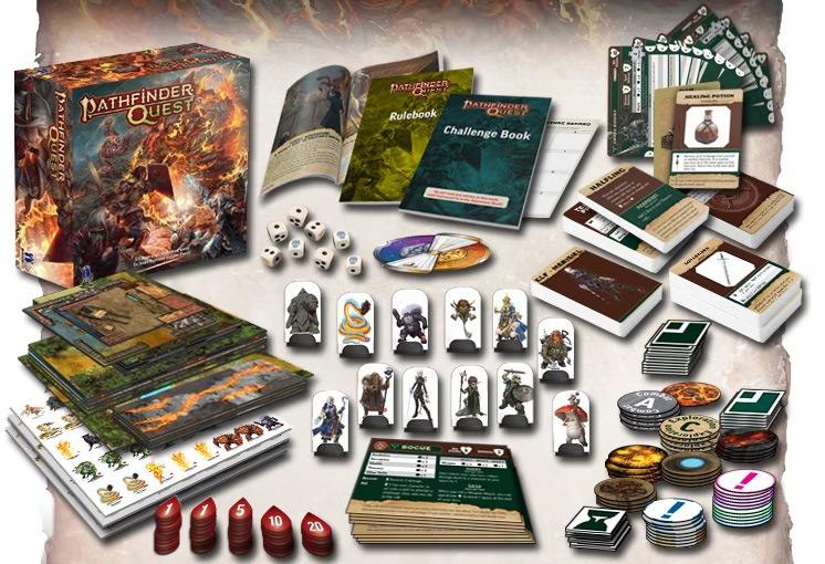 Pathfinder Quest includes an Adventure Book (detailing each one of the possible dozen adventures you might experience), a Challenge Book (containing the hidden outcomes for many of your choices), map tiles, custom dice, hundreds of cards, monster pawns, and select miniatures as well!