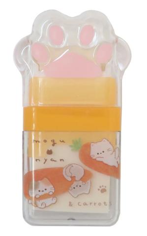 Gult suddgummi i gulligt hårdfodral med lock som kattass och motiv av morotskatter.