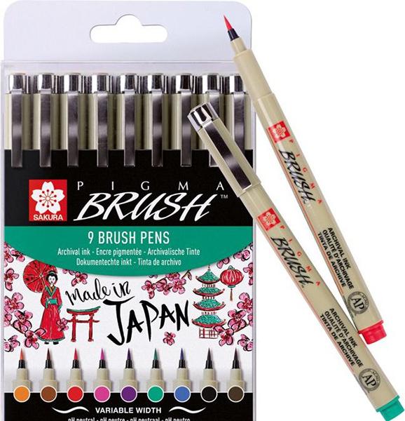 Pigma Brush är en teckningspenna med en flexibel penselspets som ger möjlighet till såväl fina detaljer som breda penseldrag, ljusbeständig, arkivsäker och blöder ej igenom papper. Set med 9 olika färger.