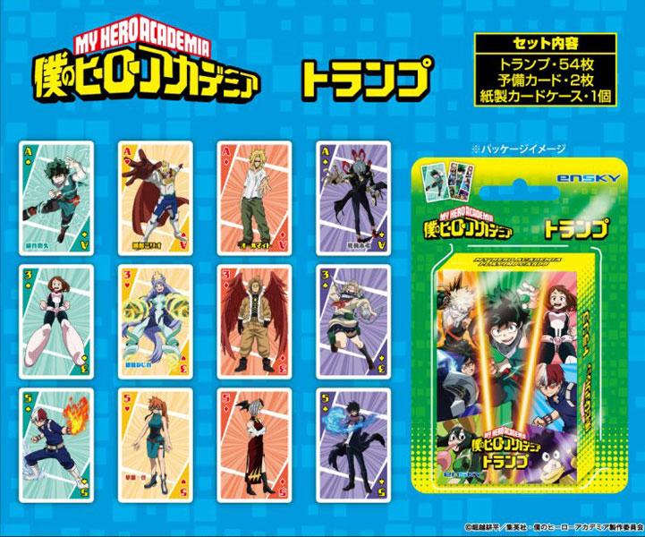 Kortlek med motiv från My Hero Academia. På varje kort finns en figur från serien, och i vänstra hörnet står dens namn på japanska. Leken innehåller 54 kort, och korten är cirka 5,8×8,9cm.