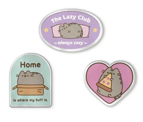 Set med tre tygmärken föreställande Pusheen i avslappnade situationer.