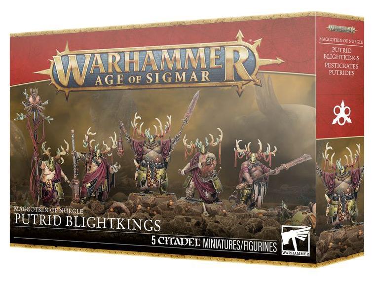 This multipart plastic kit builds five Putrid Blightkings, elite infantry for your Maggotkin of Nurgle armies in games of Warhammer Age of Sigmar. These bloated warriors specialise in hunting down enemy Priests and Wizards. When they catch their prey, they make short work of them in melee with their brutal, pox-blighted weapons. Blessed with unnatural resilience, they can easily shrug off wounds that would slay a lesser warrior, and their bodies are draped in ragged robes, giving them a twisted ceremonial appearance. The kit includes parts to build an optional champion and standard bearer, offering a degree of customisation for your devoted infantry.