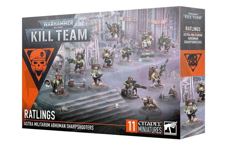 This multipart plastic kit builds 10 Ratlings, a Ratling Battlemutt, an Ammo Cache marker, and two Tripwire markers. These miniatures can be used as sharpshooting Ratlings operatives in games of Kill Team, or fielded in an Astra Militarum army in games of Warhammer 40,000. The kit includes head options and accessories to customise your kill team, plus components to build specialists like the tough Hardbit, evasive Sneak, light-fingered Stashmaster, and more.