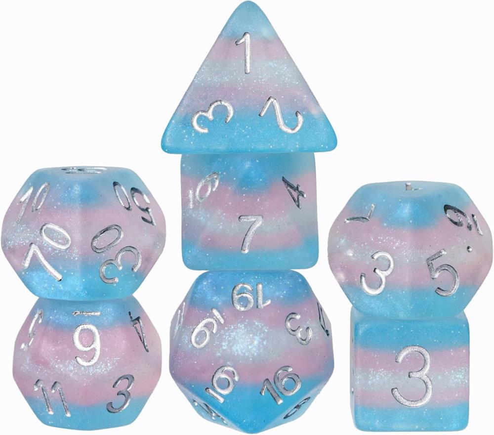 7 Piece frosted dice set with the transgender colours - light blue, light pink and white.