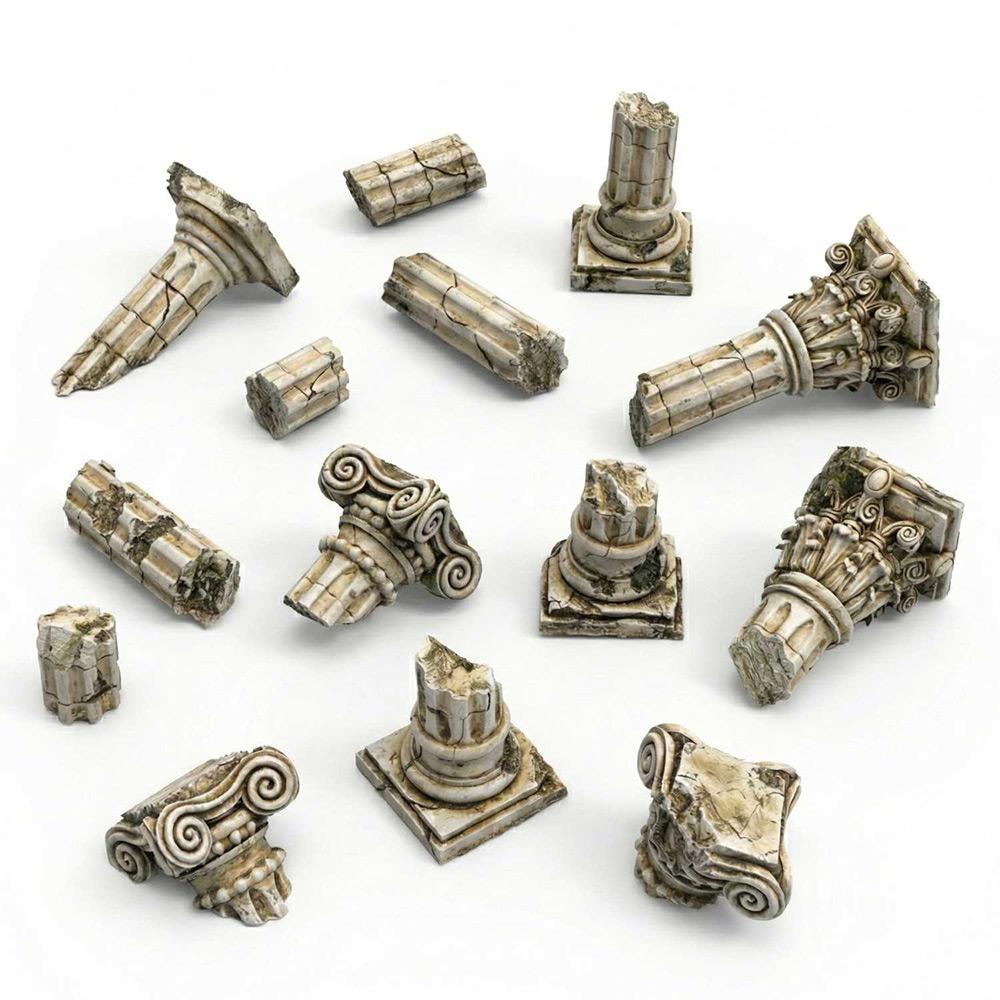 Add character to your bases and fantasy scenery with this set of gray 3D resin Greek column ruins, designed to create ruined temples, ancient squares, forgotten shrines, or architectural remains in 1:48-1:35 scale dioramas and gaming tables.