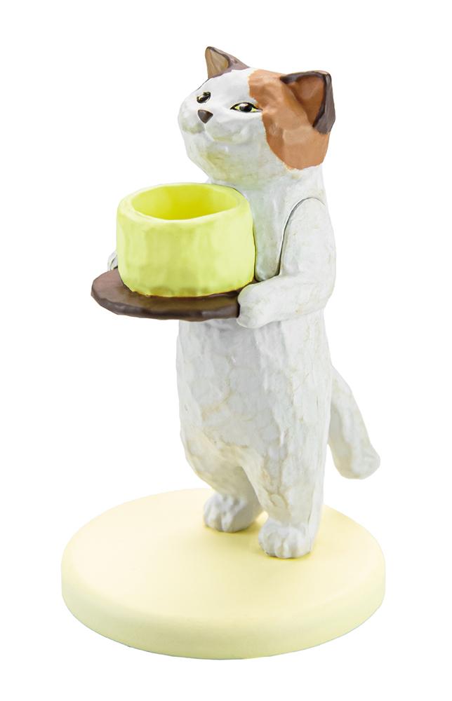 Söta små figurer föreställandes katter som håller olika typer av koppar. Figurerna är gjorda i en stil som ska likna trähantverk.