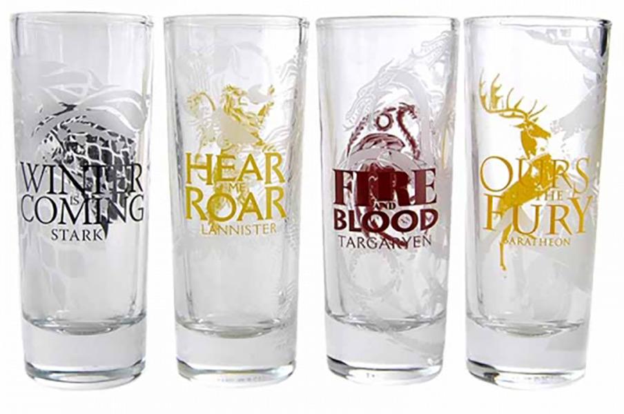 This Game of Thrones set of four shot glasses is perfect for parties. The front of each glass features the sigils of the four main houses in the story, while the back features that house's words; house Targaryen's red three headed dragon and "Fire and Blood", house Stark's grey direwolf and "Winter is Coming", house Baratheon's gold crowned stag and "Ours is the Fury" and house Lannister's yellow lion and "Hear me Roar". Each glass also features an enlarged version of the sigil in a frosted finish. Housed in a gift box, this is the perfect addition to any Game of Thrones display.