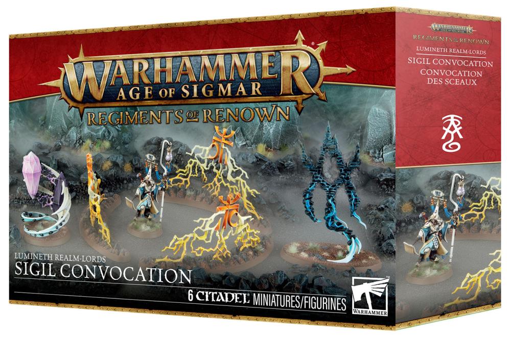 This multipart plastic kit builds a Sigil Convocation – a Regiment of Renown for your Cities of Sigmar, Daughters of Khaine, Fyreslayers, Idoneth Deepkin, Kharadron Overlords, Seraphon, Stormcast Eternals, and Sylvaneth armies in games of Warhammer Age of Sigmar. The individual units can also be used in your Lumineth Realm-lords army, and you'll save money compared to buying them individually. You'll find a Scinari Calligrave, along with a set of Endless Spells – a Sanctum of Amyntok, Hyshian Twinstones, and a Rune of Petrification. Add some powerful magic to give your armies a boost.