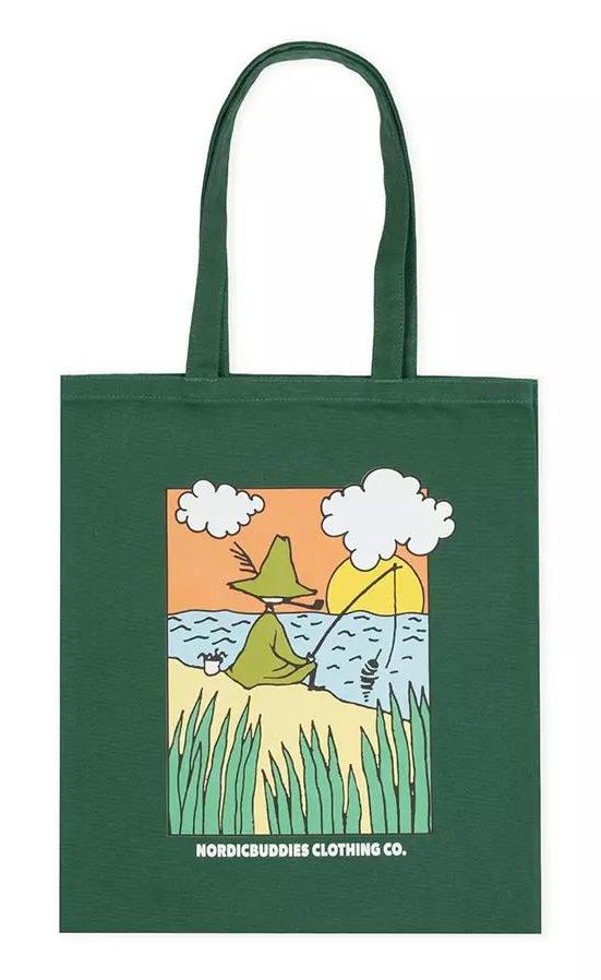 Återanvändningsbar bärkasse i grönt, prydd av bild på Snusmumriken som sitter och fiskar.