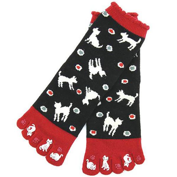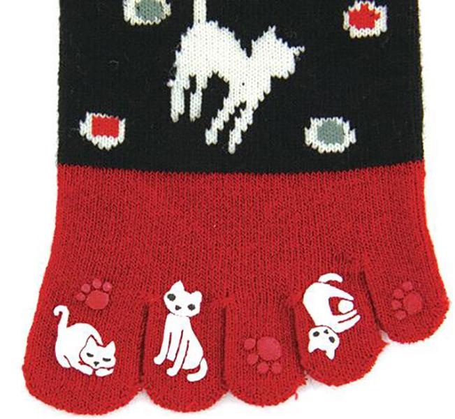 Japanska tåstrumpor med kattmotiv. Gjorda i bomull och polyester, passar storlek 36-40.
