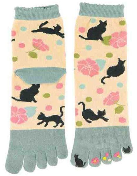Ankelstrumpor med fem tår och kattmmotiv. Strumporna har ett mönster av svarta katter mot bakgrunden, och varje tå har en egen söt liten bild. Passar storlek 38-39.