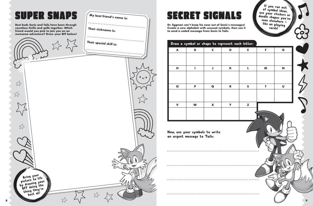 Write your own funny story about a classic Sonic vs Metal Sonic showdown, learn how to draw the adorable chao, invent your own secret code to send a message to Tails, sketch a new, evil robot for Dr. Eggman – and more!