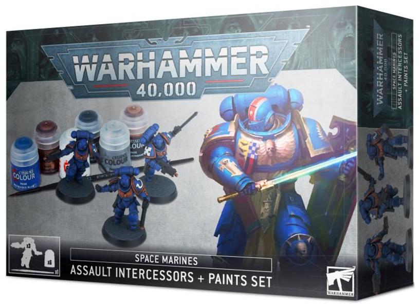You'll get three plastic Assault Intercessors with three distinct poses, the paints you need to prepare them for battle and a brush to get you started. These models are push fit, only requiring clippers to assemble.