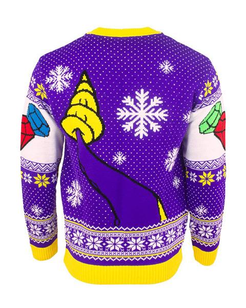 Stickad lila och gul jultröja med draken Spyro. Absolut en av de sötaste filurerna att sprida glädje med under högtiden! Dessutom pryds tröjan av fina snöflingemönster och på ärmarna finns de fina ädelstenarna från spelet.