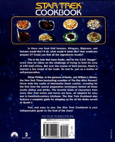 Följ med på en spännande gastronomisk resa genom Star Treks universum. Neelix, kock ombord på USS Voyager, har här sammanställt en mängd olika favoritrecept, alla anpassade till de ingredienser vi jordbor antas ha i våra kök. En del recept är bekanta och inte alls svåra att följa med i medan andra... tja, vad sägs om lite Kasha Varnishkas à la Vulcan? Men denna kokbok är inte bara mat. Man får även lära sig hur man blandar till några av de drinkar man kan beställa i Quarks bar. Romulan Ale, klingonskt blodvin och aldebarisk whiskey är några exempel. Som Quark själv säger i förordet: Köp boken! Laga maten! Berätta för alla dina vänner! Du kommer att älska den! Illustrerad i svart-vitt.