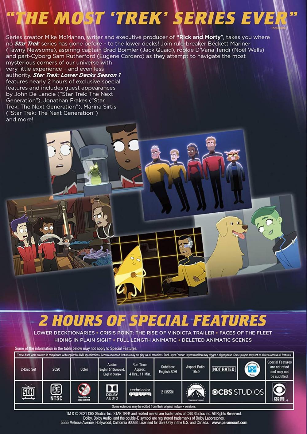 Series creator Mike McMahan, writer and executive producer of “Rick and Morty”, takes you where no Star Trek series has gone before – to the lower decks! Join rule-breaker Beckett Mariner, aspiring captain Brad Boimler, rookie D’Vana Tendi and part-Cyborg Sam Rutherford as they attempt to navigate the most mysterious corners of our universe with very little experience – and even less authority. Star Trek: Lower Decks Season 1 features nearly 2 hours of exclusive special features and includes guest appearances by Paul Scheer (“The League”), Jonathan Frakes (“Star Trek: The Next Generation”), Marina Sirtis (“Star Trek: The Next Generation”) and more!