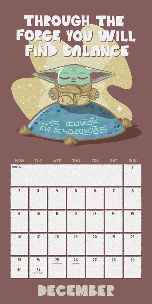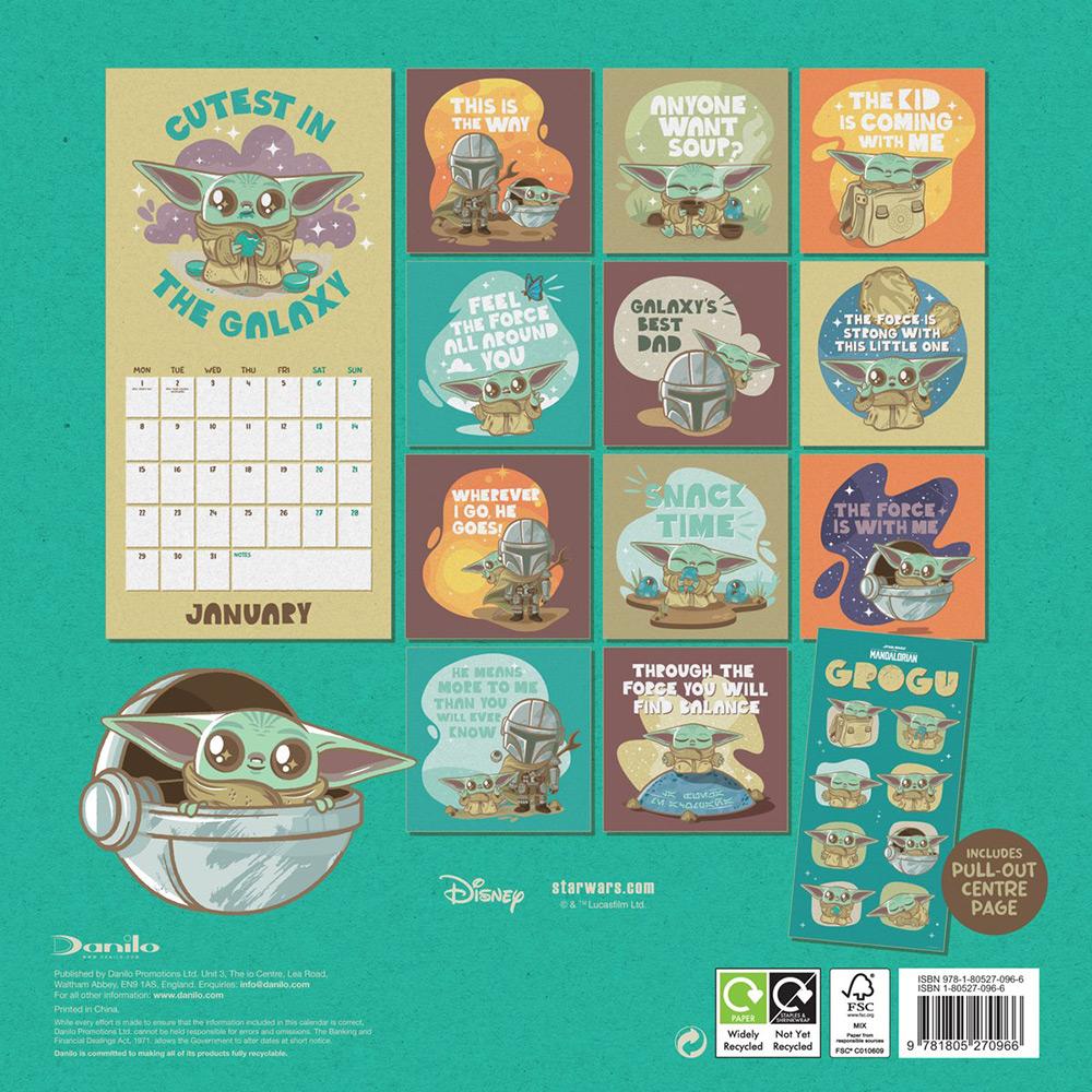 2024 Star wars: The Mandalorian: Grogu Square Calendar. This official square calendar features images of the loveable Grogu also known as 'Baby Yoda' or 'The Child' from the Star Wars Disney+ series 'The Mandalorian'. There are also famous quotes given alongside the Grogu imagery as well as plenty of room for all your 2024 appointments in the large monthly date panels provided.