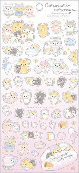 Den blyga katten Coronya har pyjamasparty! Gulligt stickerset föreställande Coronya och alla hans vänner