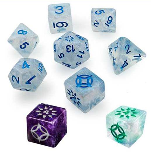 A set of sparkly Stormlight-themed blue and white die that includes all the dice you need to play the Cosmere Roleplaying Game: six standard RPG dice plus three custom plot die in a blister pack.