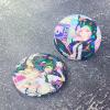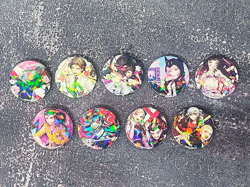 Holografisk knapp med motiv föreställande karaktärerna från Danganronpa.