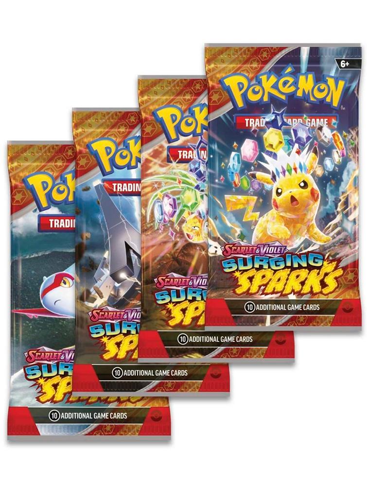 Terawatts of electricity crash down from the sky in a tropical paradise, setting the stage for the supercharged Pikachu ex! With the power of a Stellar Tera Pokémon ex, it lights up the shoreline, revealing a parade of dragon Pokémon led by the towering Alolan Exeggutor ex! Archaludon ex and Latias ex round out the horde, while new ACE SPEC cards and more new Pokémon ex bring surprises of their own. Currents crackle and Dragon types roar in the Pokémon TCG: Scarlet & Violet—Surging Sparks expansion!?
