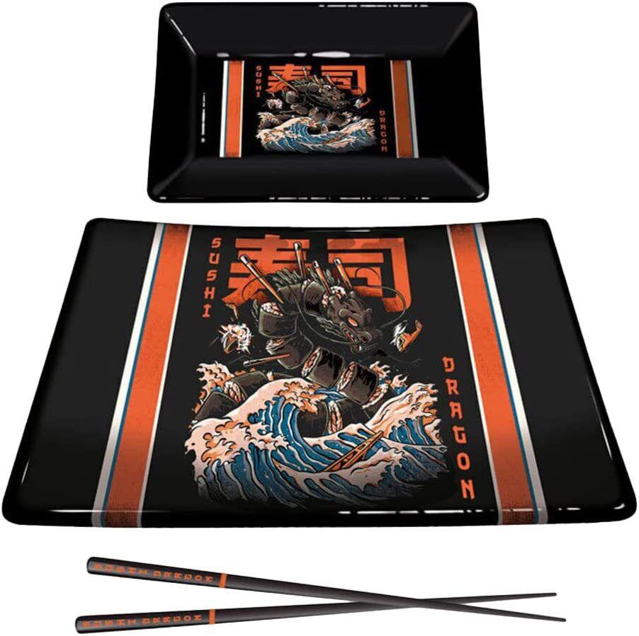 Ett set i tre delar med motiv av en sushidrake! Setet innehåller en tallrik, ett sojafatt och ett par ätpinnar.