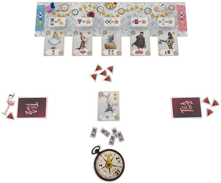Tea for 2 is an easy-to-learn, yet hard to master deck-building game set in Alice's Wonderland that combines easy rules and strategic play. To do battle, players simultaneously flip over the top card of their decks. The player with the highest card can use the card's effect or buy a new card for their deck! Players will collect hourglasses and tarts, and try to keep their hands on the pink flamingo to win!