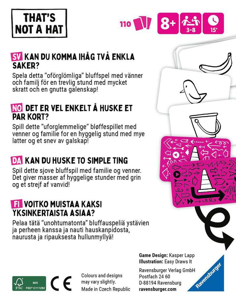 Var det en cykel eller en trafikkon? That's Not A Hat är ett bluffspel där spelarna ska ta emot och ge bort föremål. Det enda problemet är att när du ger presenten vidare så ofta glömmer du ibland vad du ger bort! Bluffa om vad du ger bort och du kanske lyckas, men om din presentmottagare inte tror dig, kan du sluta med ett straff. När en spelare har tre straffpoäng räknar alla sina straffpoäng och den spelare som har minst poäng vinner!