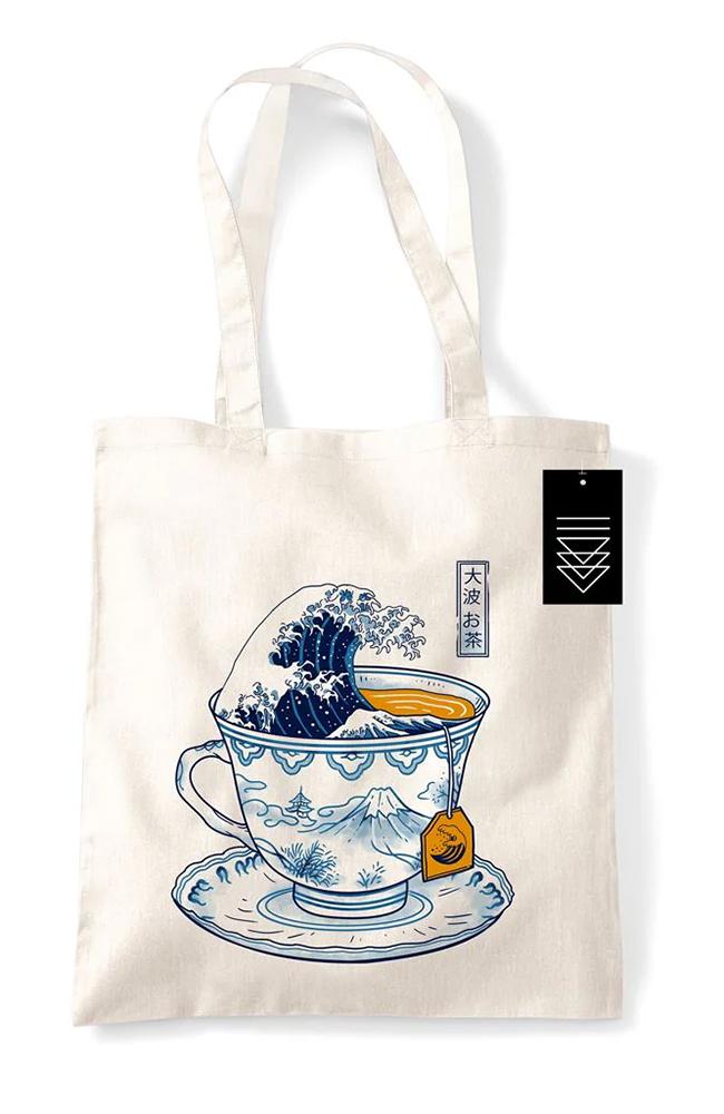 Bärkasse i tyg med motiv av jättevåg som slår upp ur en tekopp. 37cm x 42cm.