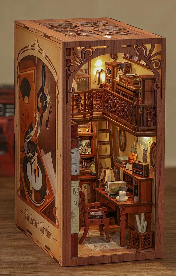 Bygg ihop din alldeles egna lilla book nook att sätta i bokhyllan! Ett diorama över ett mysigt litet hembibliotek som kan lysas upp med inbyggda batteridrivna små lampor.